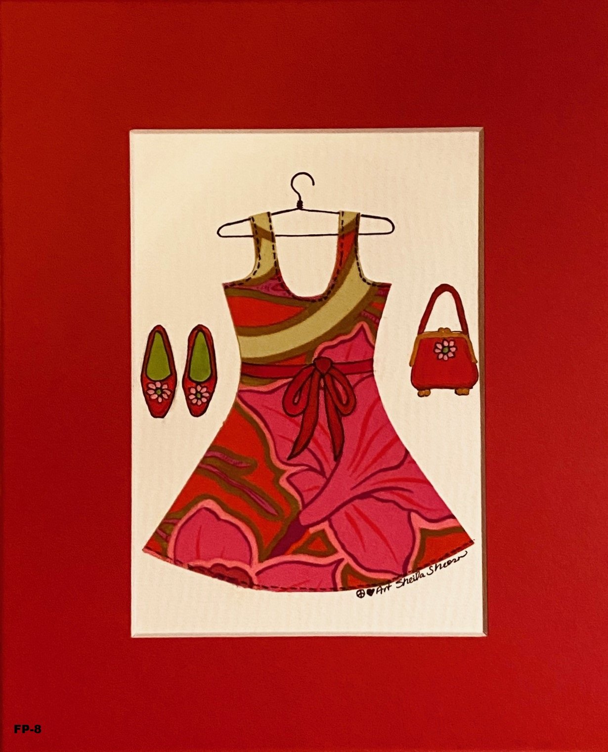 Cute, fun, and fashionable! These multi-media art pieces are great for your dressing room, a teen's bedroom, and especially for someone who just loves clothing design! The 8"x10" mats are color coordinated with the outfits that are in the 4"x6" opening (the inventory code shown is not on the original piece). Ready for your frame.