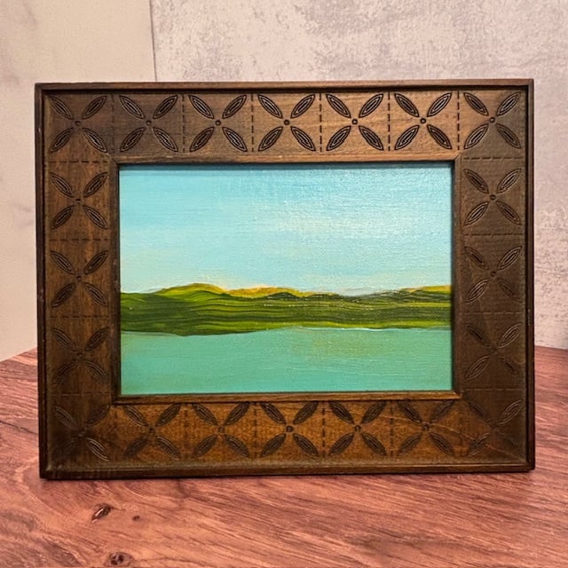 Original 5" x 7" acrylic painting in a carved brown stained wood frame.