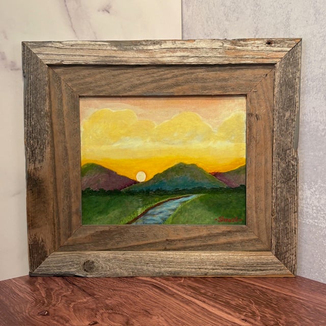 Original 8" x 10" acrylic painting in a vintage farm looking wood frame for a final outside measurement of 12 7/8” x 14 3/4”.