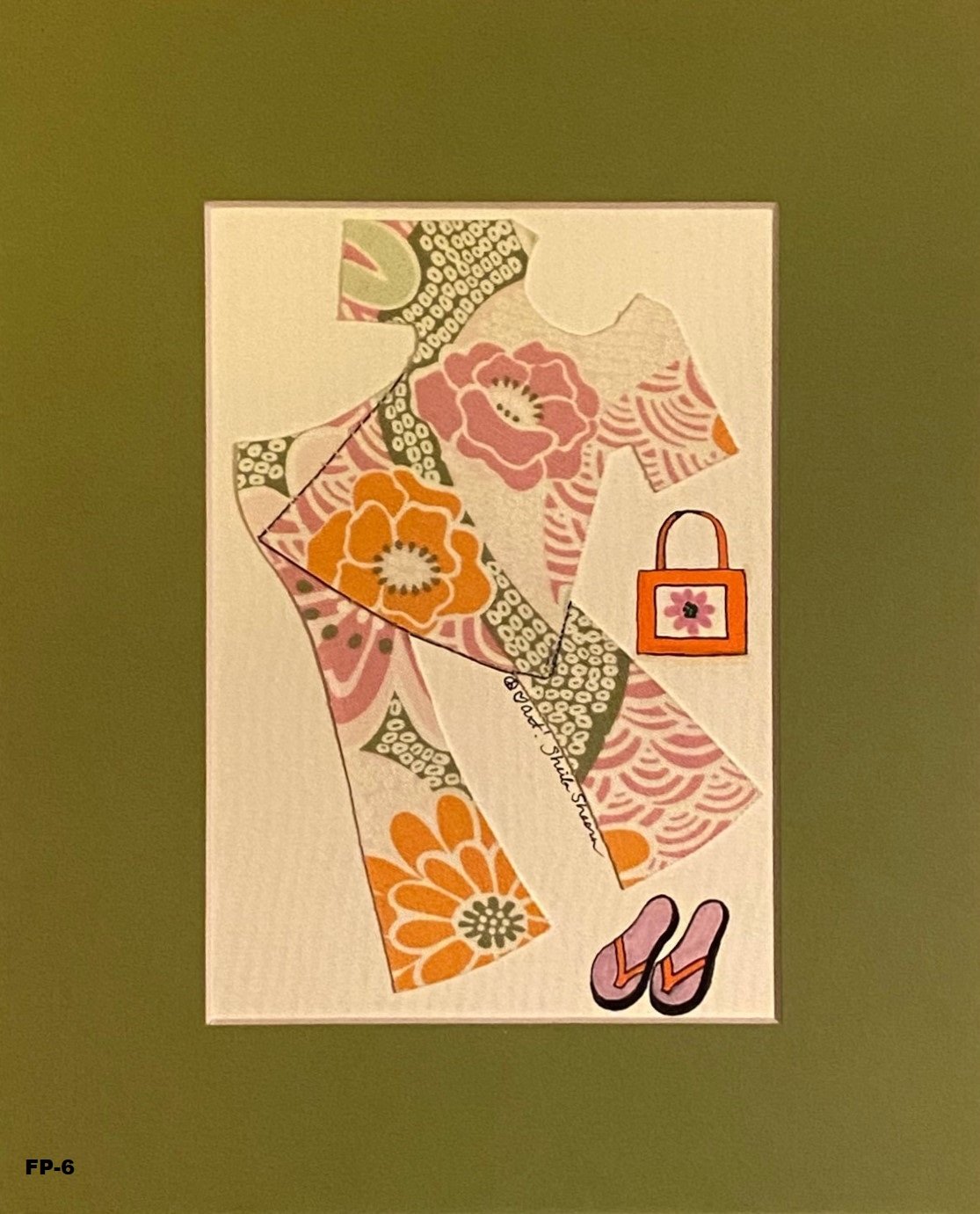 Cute, fun, and fashionable! These multi-media art pieces are great for your dressing room, a teen's bedroom, and especially for someone who just loves clothing design! The 8"x10" mats are color coordinated with the outfits that are in the 4"x6" opening (the inventory code shown is not on the original piece). Ready for your frame.